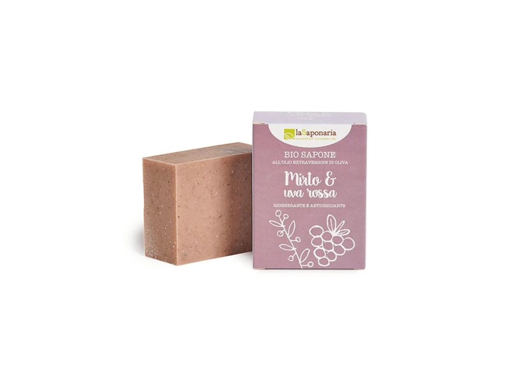 Přírodní, ručně vyráběné mýdlo na obličej i tělo je založené na čisticí a vyživující síle extra panenského olivového oleje. Kromě toho má i regenerační a antioxidační účinky, a to díky obsahu výtažků ze semínek červených hroznů. Ty jsou plné vitamínů, polyfenolů a resveratrolu, účinného přírodního antioxidantu. Díky němu toto mýdlo podporuje vitalitu pokožky a bojuje proti jejímu stárnutí. Esenciální olej z myrty pak mýdlo nádherně rozvoní. Jemné, regenerační složení v BIO kvalitě je ideální pro zralou a citlivou pokožku.