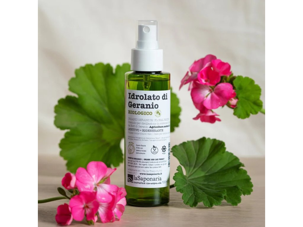 Omamně voňavé pelargonie vyrostly na malé italské bio farmě v provincii Teramo, kde květy sklízejí v pravý moment, kdy obsahují nejvíce aktivních látek. Svou osvěžující, antiseptickou a uklidňující sílu propůjčují BIO květové vodě, stočené do lahvičky z recyklovaného plastu. Hydrolát z gerania si oblíbíte pro každodenní péči o pleť, ocení ji zašedlá pokožka bez života a jiskry, kterou krásně prozáří. Pomůže při odličování, čištění i tonizaci pleti a je skvělou ingrediencí také do DIY kosmetiky.