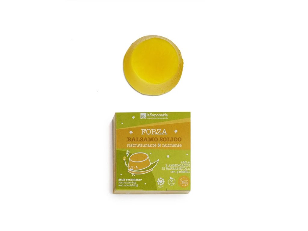 Tuhý přírodní kondicionér rozmazlí vlasy od kořínků po konečky. Výtažek z indického angreštu stimuluje růst vlasů, zatímco amino kyseliny z řepy hydratují pokožku hlavy. Kokosový olej a kakaové máslo vyživí suché a poničené kadeře, lněný olej je pomůže zregenerovat a antioxidanty nabušená kurkuma dodá pramínkům krásný lesk. Důležité jsou i prebiotika z čekanky. Podporují prospěšné mikroorganismy v pokožce, a harmonizují tak mikrobiom. Speciálně uzpůsobené pH kondicionéru uzavře vnější vrstvu vlasu, zamezí tak poletování a elektrizování vlasů. Kondicionér je navíc koncentrovaný, takže kostka vydrží zhruba stejně jako 200 ml běžného tekutého kondicionéru.